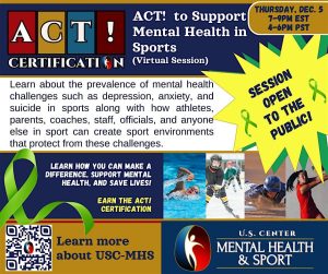 The objectives of the USC-MHS ACT! Certification are much like those of a first aid course. We will teach the signs and symptoms of a mental health challenge and/or crisis, how to de-escalate a situation to avoid harm to oneself or others, and what pathways are available for additional professional support. The course also focuses on those factors about sport participation that can protect individuals from experiencing mental health challenges and those factors that can put them at greater risk. Our training always includes national and local community resources that can be utilized for additional mental health support.
